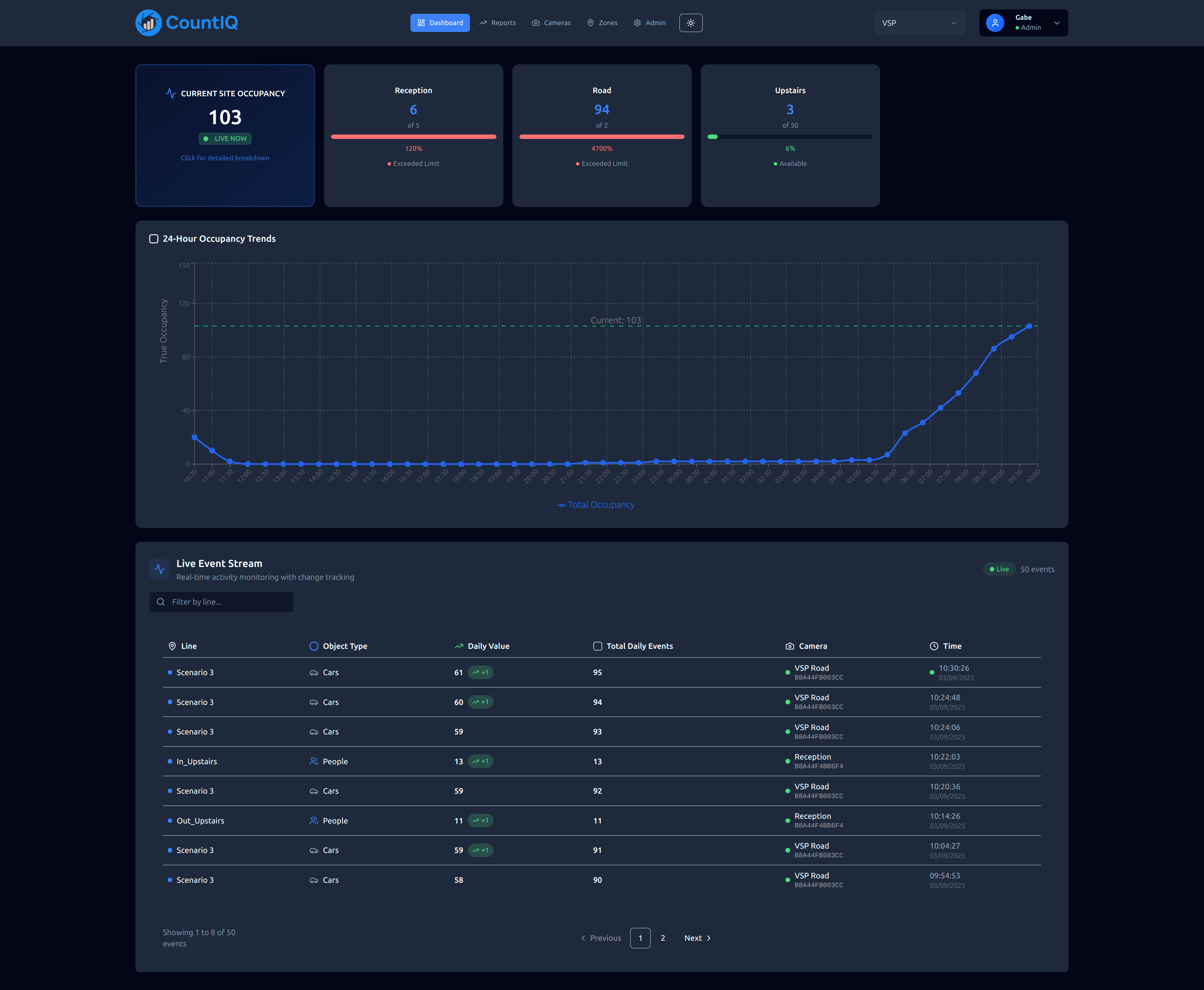 Real-time occupancy monitoring with 24-hour trends and live event tracking with detailed analytics.