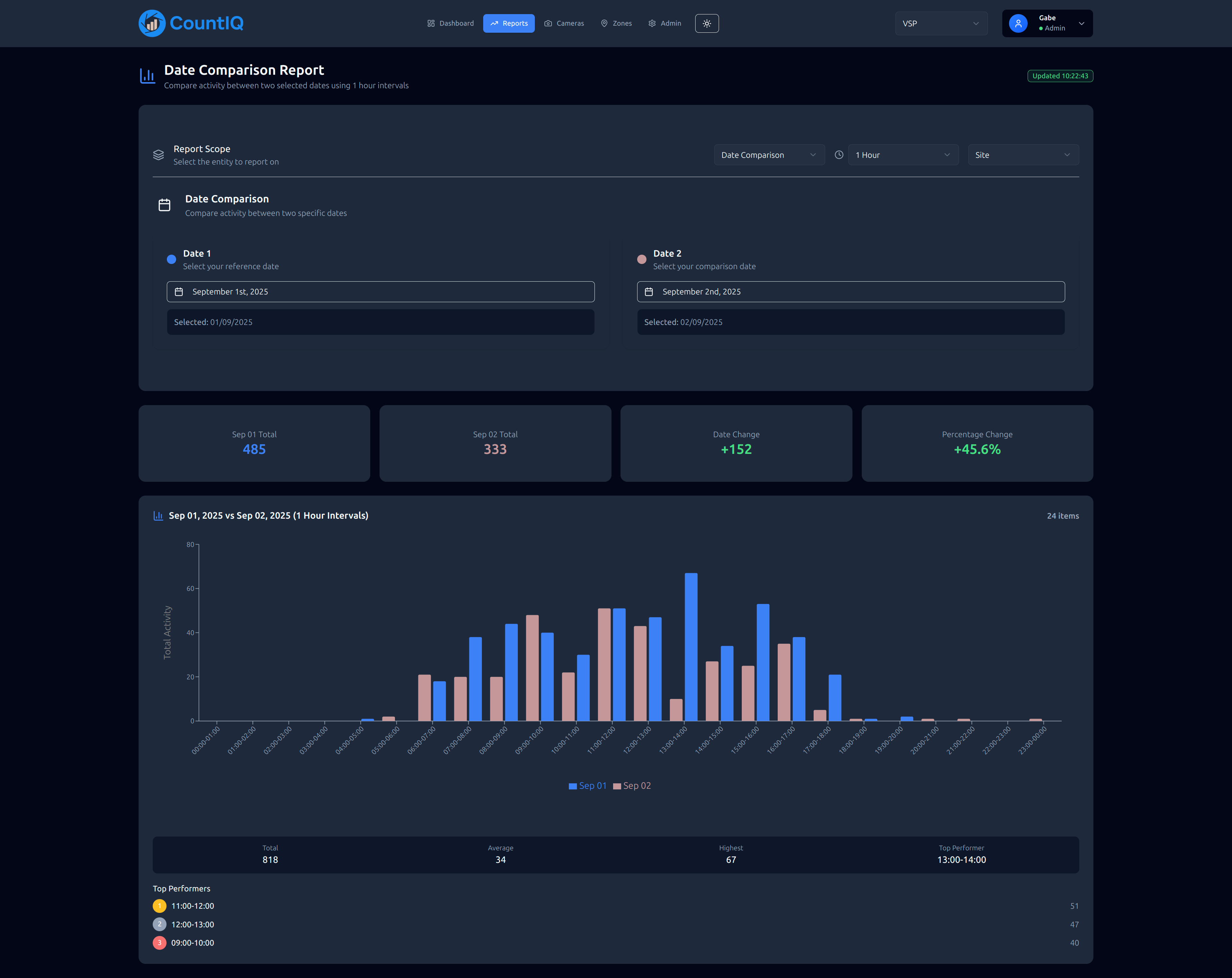 Compare activity between specific dates with comprehensive insights and performance indicators.