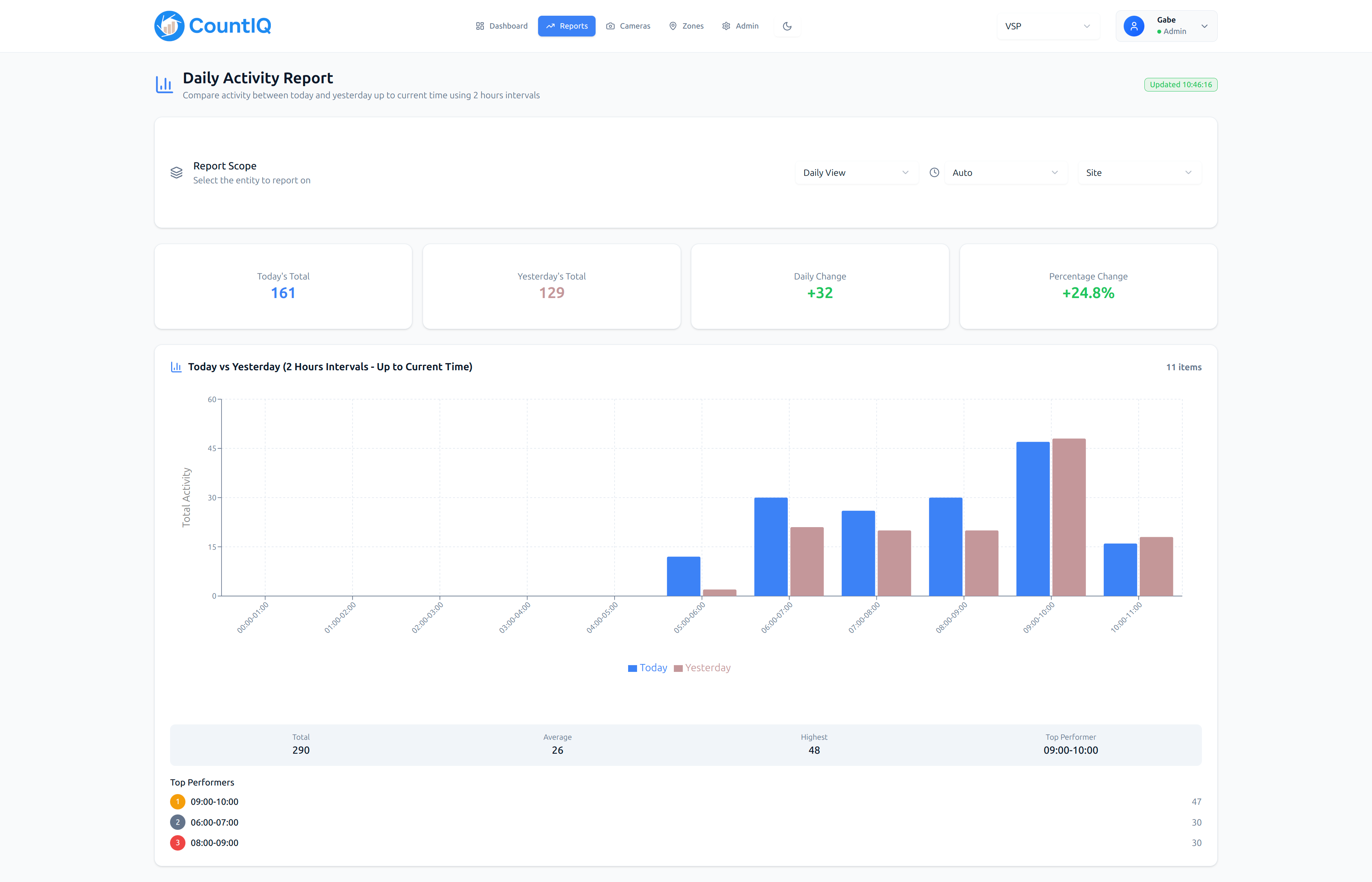 Compare activity between today and yesterday with detailed hourly breakdowns and percentage changes.